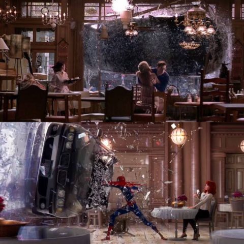 冒頭5分でサラッと「スパイダーマン」3部作のピーター・パーカーの過去の名場面をアニメで振り返っちゃうのは感心したんだけど、レストランの場面は思わず笑ってしまった。