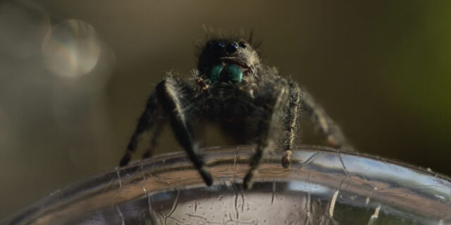 天敵の寄生バチから卵を守る為に地上へ避難したハエトリグモに見た事も無い脅威=ヤモリ🦎が迫る‼️