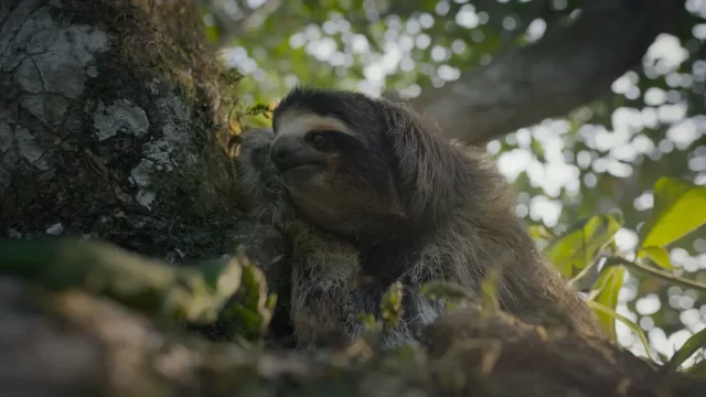 目前に無害な🦥と御対面中で兄妹に置き忘れられたイグアナの上にオオハシと下に🐊の脅威が迫る。