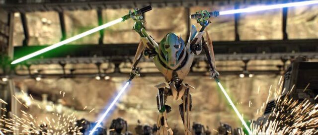 馴染みのメインテーマ曲が終わり下にパンし広がる惑星コルサントの真上で繰り広げる艦隊&戦闘機の迫力あるドンパチ劇場から中盤の眼光ドアップがリアルなグリーバス将軍のフルCGと応援するっきゃ無いヨーダ✨