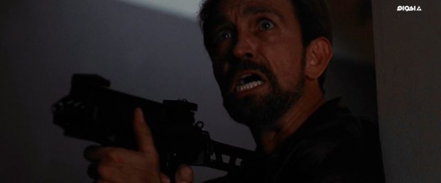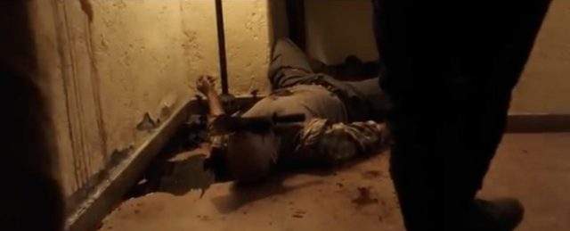 本編で敵をあっさり一掃して既に虫の息で地面を頑張って這いつくばって逃げる様子を床に転がっているショットガンと逃げる男を捉えながらの空気椅子です。